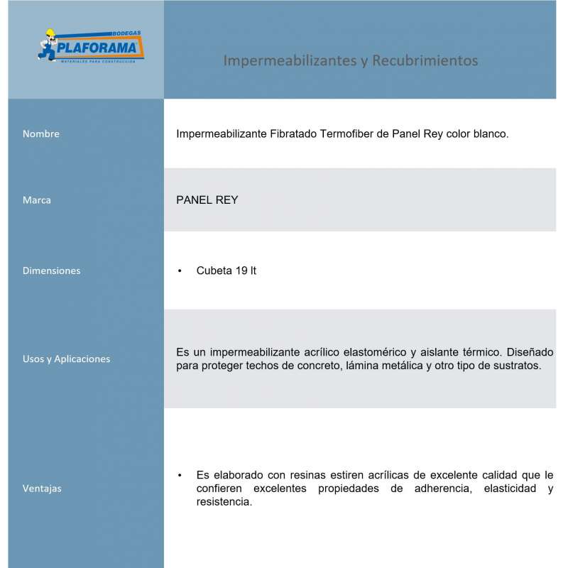 El impermeabilizante fibratado Termofiber 5 años en cubeta de 19 L color blanco, es un eficaz recubrimiento impermeable y térmico en techos de concreto, asbesto, lámina galvanizada y otro tipo de sustratos.