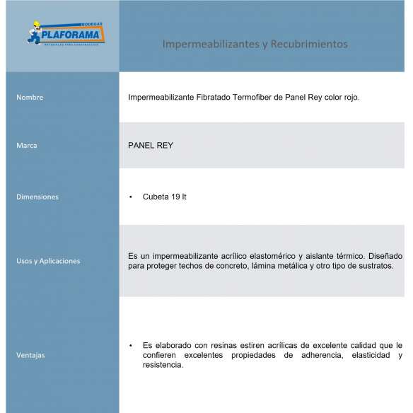 El impermeabilizante fibratado Termofiber 5 años en cubeta de 19 L color rojo, es un eficaz recubrimiento impermeable y térmico en techos de concreto, asbesto, lámina galvanizada y otro tipo de sustratos.