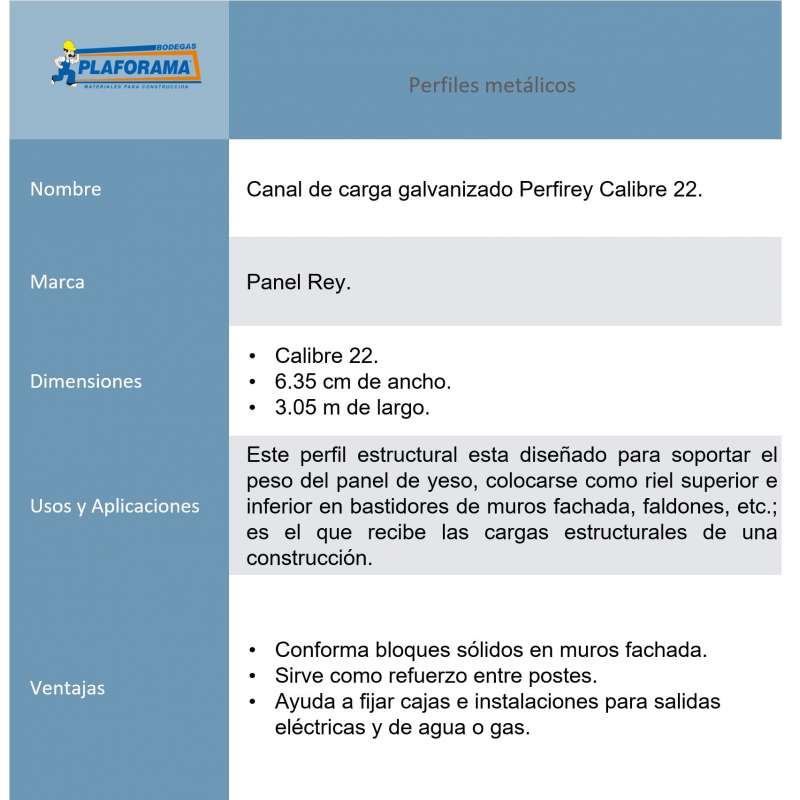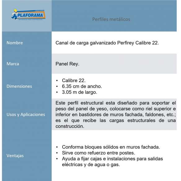 El Canal de Carga Perfirey Calibre 22 con medidas de 6.35 cm de ancho x 3.05 m de largo, está diseñado para soportar el peso del panel de yeso y recibir las cargas estructurales de la construcción ligera.