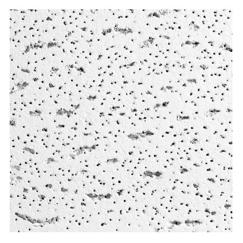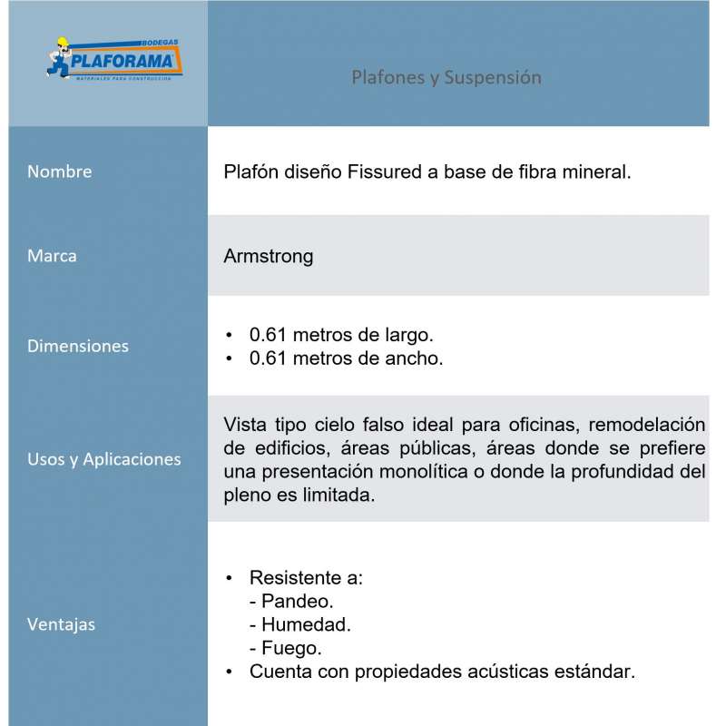 Plafón diseño Fissured de 0.61 por 0.61 metros, a base de fibra mineral.