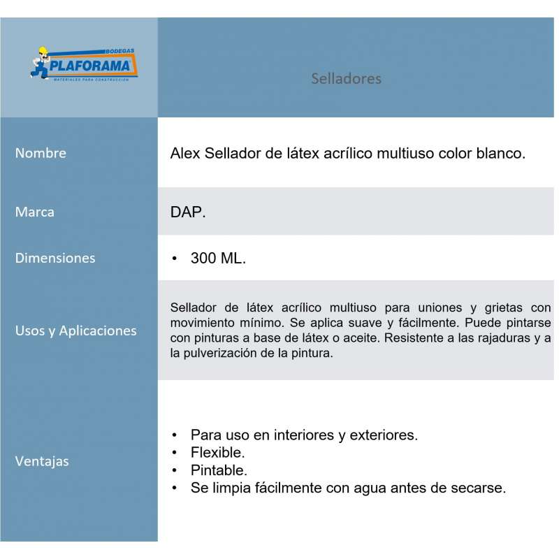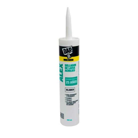Sellador de látex acrílico multiuso para uniones y grietas con movimiento mínimo. Se aplica suave y fácilmente. Puede pintarse con pinturas a base de látex o aceite. Resistente a las rajaduras y a la pulverización de la pintura.