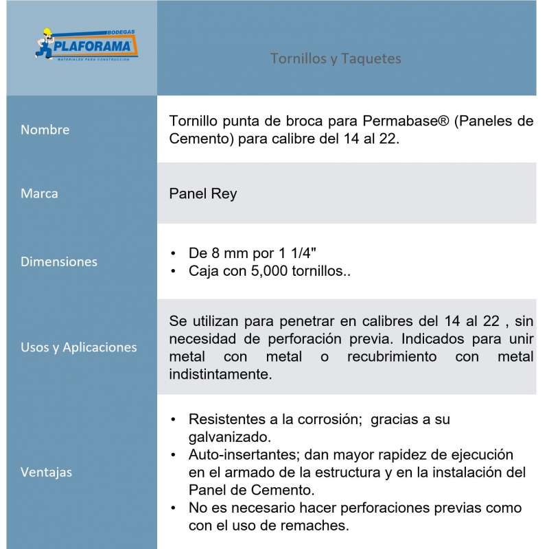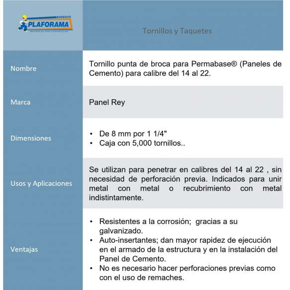 Resistentes a la corrosión; gracias a su galvanizado. Auto-insertantes;dán mayor rapidez de ejecución en el armado de la estructura y en la instalación del Panel de Cemento. No es necesario hacer perforaciones previas como con el uso de remaches.
