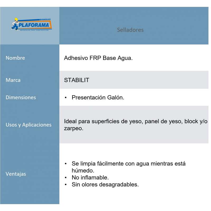 Adhesivo base agua formulado específicamente para la instalación de paneles FRP sobre superficies porosas.