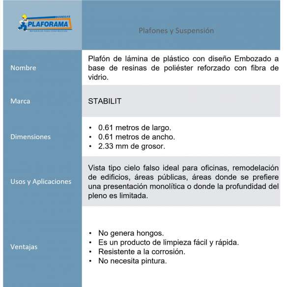Plafón de lámina de plástico con diseño Embozado de 0.61 por 0.61 de 2.3mm, a base de resinas de poliéster reforzado con fibra de vidrio.