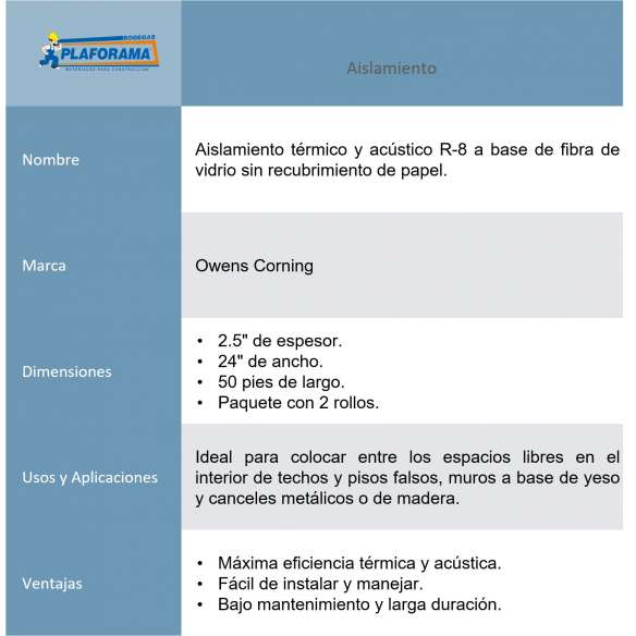 Aislamiento R-8 de 5cm(2.5") x 61cm(24") x 15m(50ft) Paq 2 rollos s/papel
