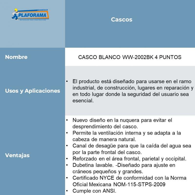 Casco blanco de seguridad clase ""E"" con suspensión textil resistente a más de 20,000 voltios. Composición de 90% polietileno, 1.5% pigmento con base de polietileno y 0.5% aditivo mineral.