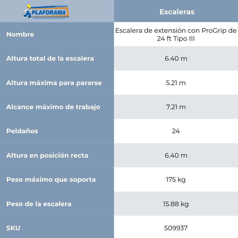 Escalera de extensión- Hasta 6.40 m de altura ( 24 piés). Capacidad de carga 175 kg. Peldaños en Pro-Grip para evitar que se resbale el pié.