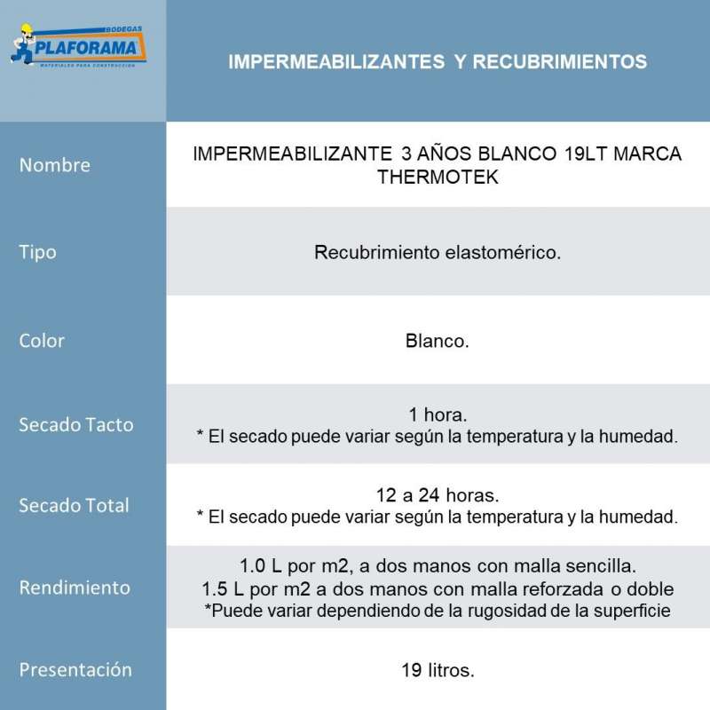 El impermeabilizante Acrílico Thermotek 3 años en cubeta de 19 L color blanco, es un eficaz recubrimiento impermeable y térmico en techos de concreto, asbesto-cemento, entre otros. En casas habitación, hoteles, fábricas, bodegas, etc. Es útil también para mantener y renovar sistemas impermeables ya existentes bien adheridos.