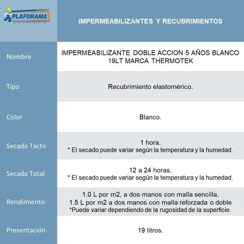 El impermeabilizante Thermotek Doble Acción 5 años en cubeta de 19 L color blanco, es un eficaz recubrimiento impermeable y térmico en techos de concreto, asbesto-cemento, entre otros. En casas habitación, hoteles, fábricas, bodegas, etc. Es útil también para mantener y renovar sistemas impermeables ya existentes bien adheridos.