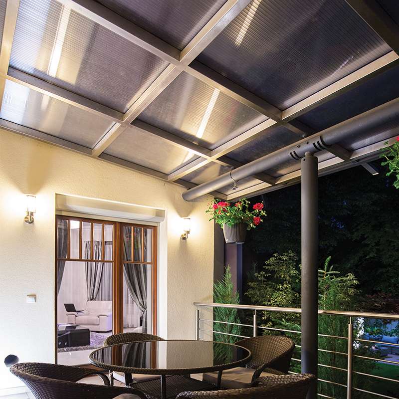 La placa de policarbonato tiene propiedades de aislamiento tĂ©rmico y acĂșstico. Ofrece protecciĂłn contra los rayos UV y maximiza la entrada de luz natural, lo cual contribuye al ahorro de energĂ­a.
