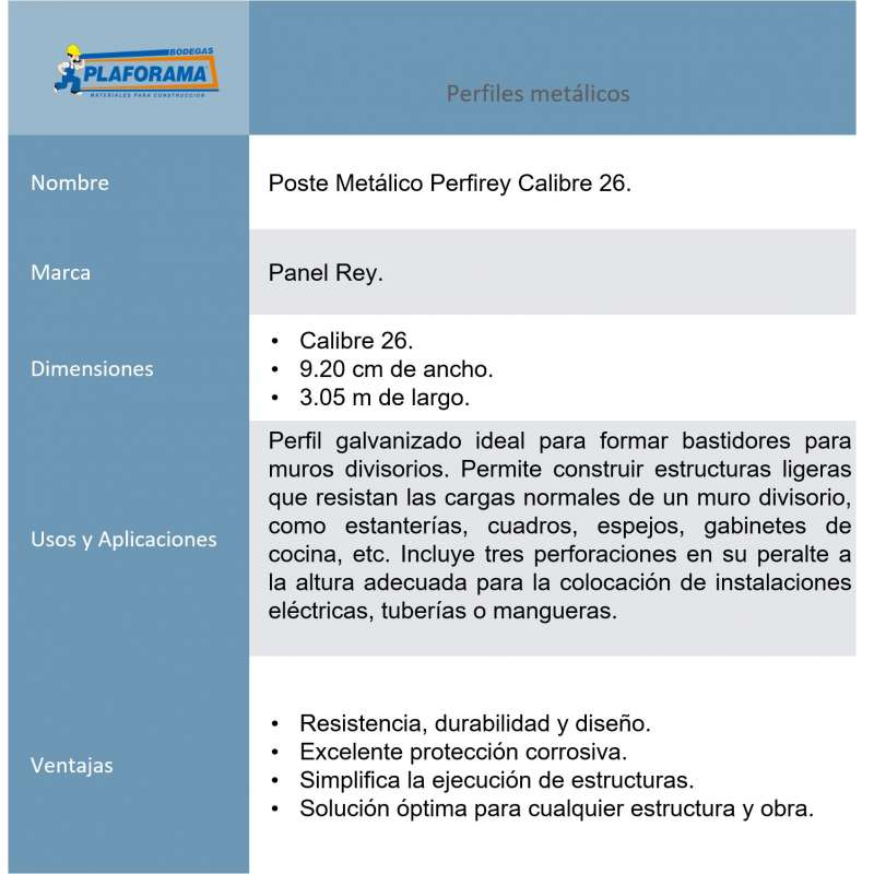 - Poste metálico Perfirey calibre 26 medidas 9.20cm x 3.05m