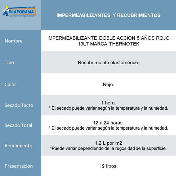 El impermeabilizante Thermotek Doble Acción 5 años en cubeta de 19 L color rojo, es un eficaz recubrimiento impermeable y térmico en techos de concreto, asbesto-cemento, entre otros. En casas habitación, hoteles, fábricas, bodegas, etc. Es útil también para mantener y renovar sistemas impermeables ya existentes bien adheridos.