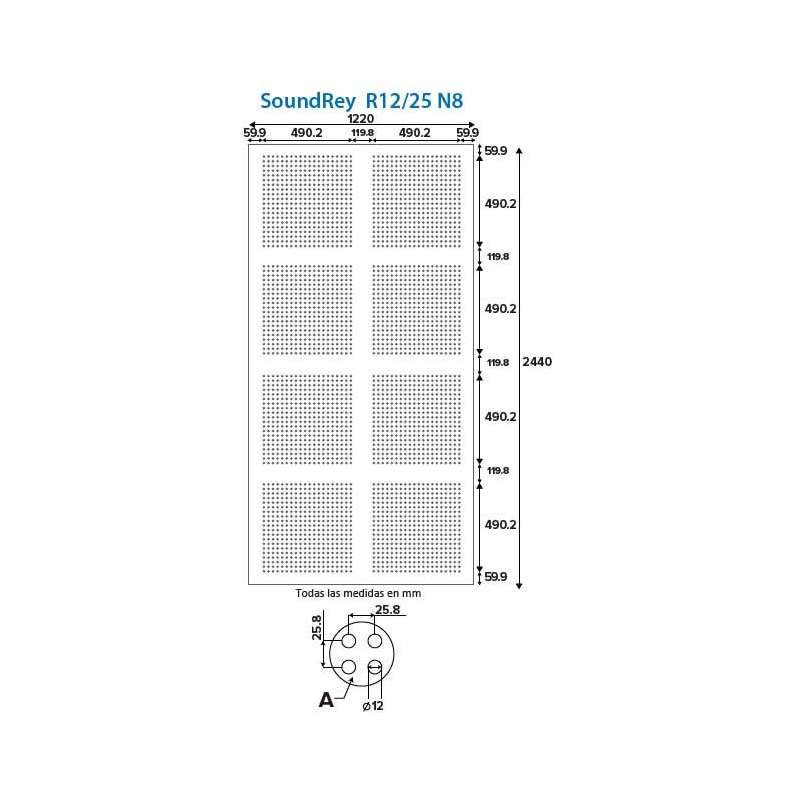 EL panel de yeso acústico Sound Rey R12/25 N8 con medidas 1.22m x 2.44m x 12.7mm fue diseñado para mejorar la absorción acústica y crear una barrera contra el polvo y partículas.