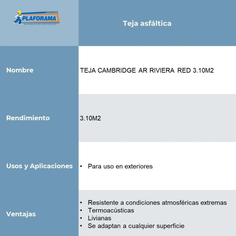 La teja asfáltica de tipo arquitectural modelo Cambridge color Riviera Red marca IKO es una teja de diseño superior, con una capa extra y más gruesa que las tejas convencionales, que hace que el producto sea más durable. IKO es marca Canadiense líder en productos de asfalto a nivel mundial, con más de 60 años de experiencia.